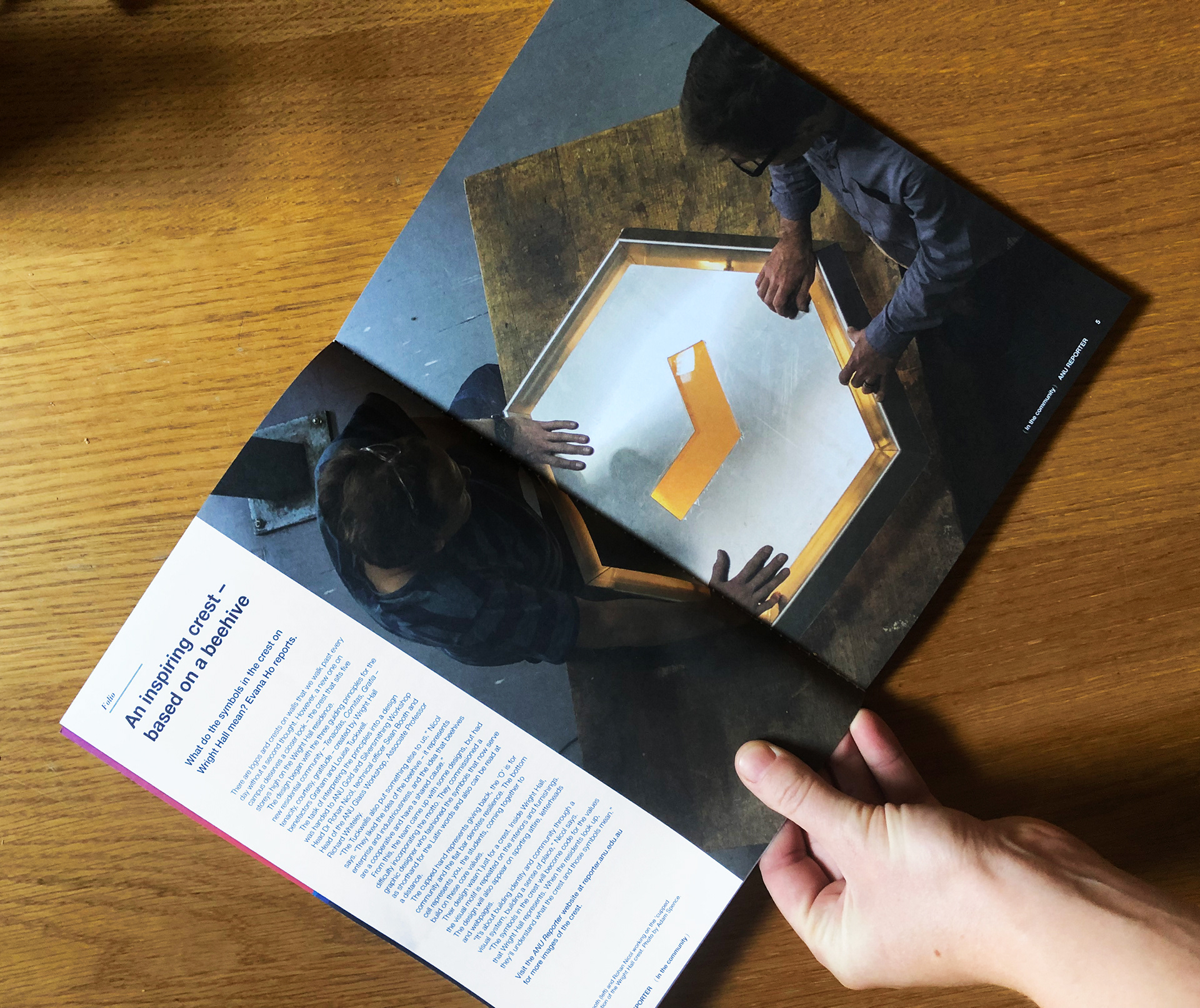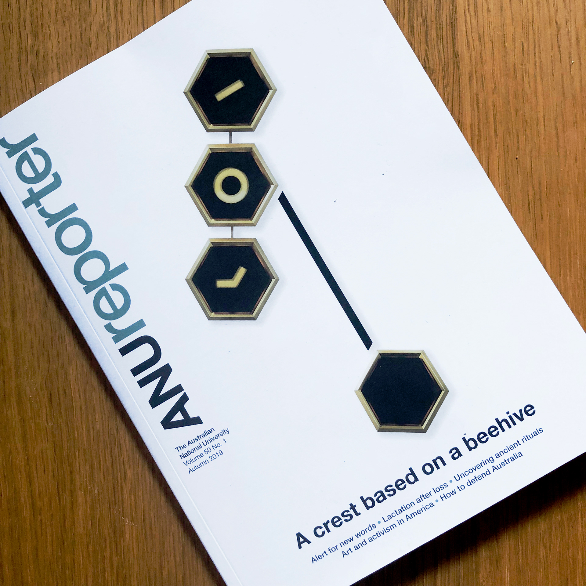 Identity design and complete brand rollout for ANU's new residential college Wright Hall. A collaboration with ANU Gold and Silversmithing Workshop Head Dr Rohan Nicol, technical officer Sean Booth and Head of the ANU Glass Workshop, Associate Professor Richard Whiteley to visually realise Wright Hall's motto - Tenacitas, Comitas, Gratia (tenacity, courtesy, gratitude) as a brand and a physical crest on the side of the new building, five stories high. The symbols within each cell of the design serve as shorthand for the motto: the cupped hand represents giving back, the circle is for community and the flat bar denotes resilience.